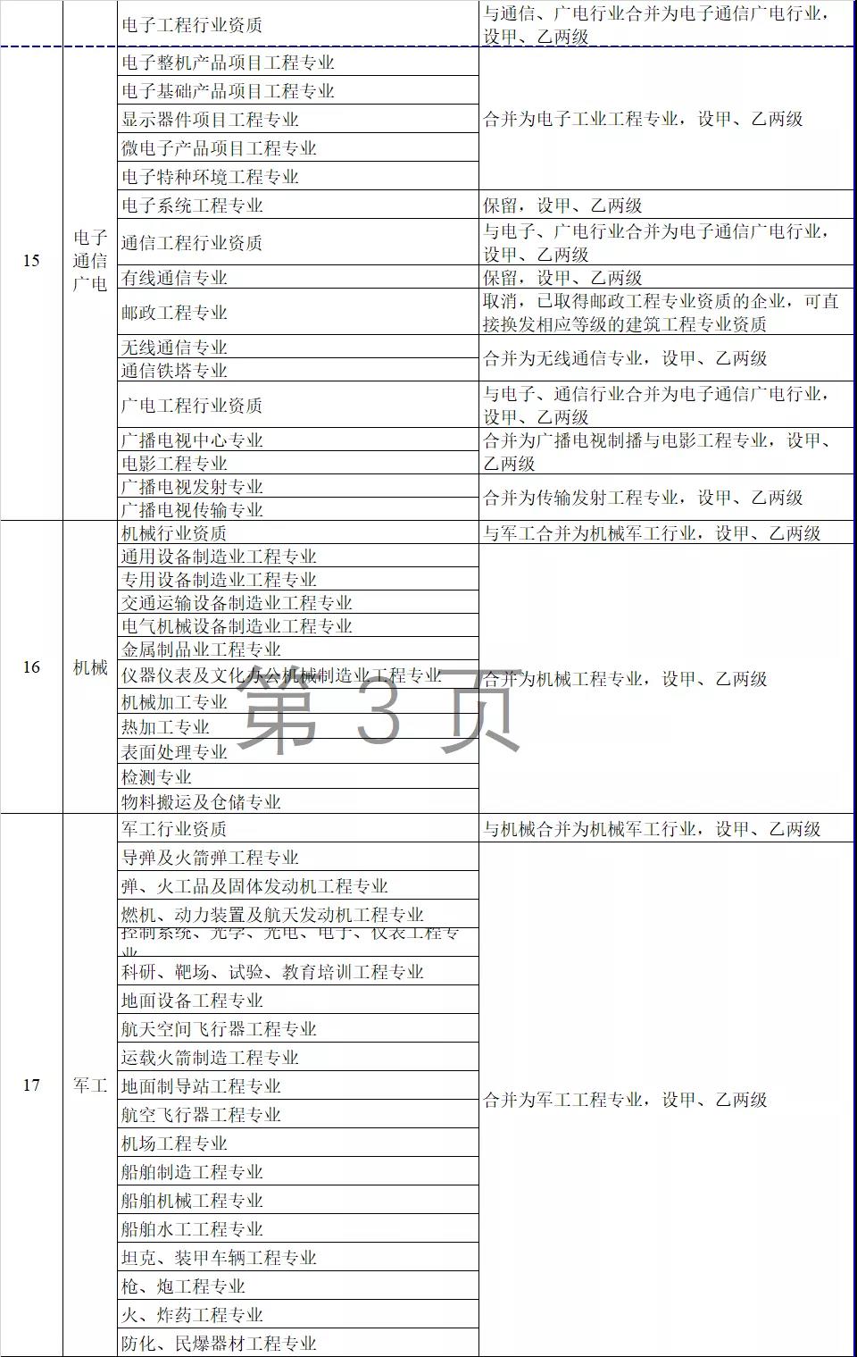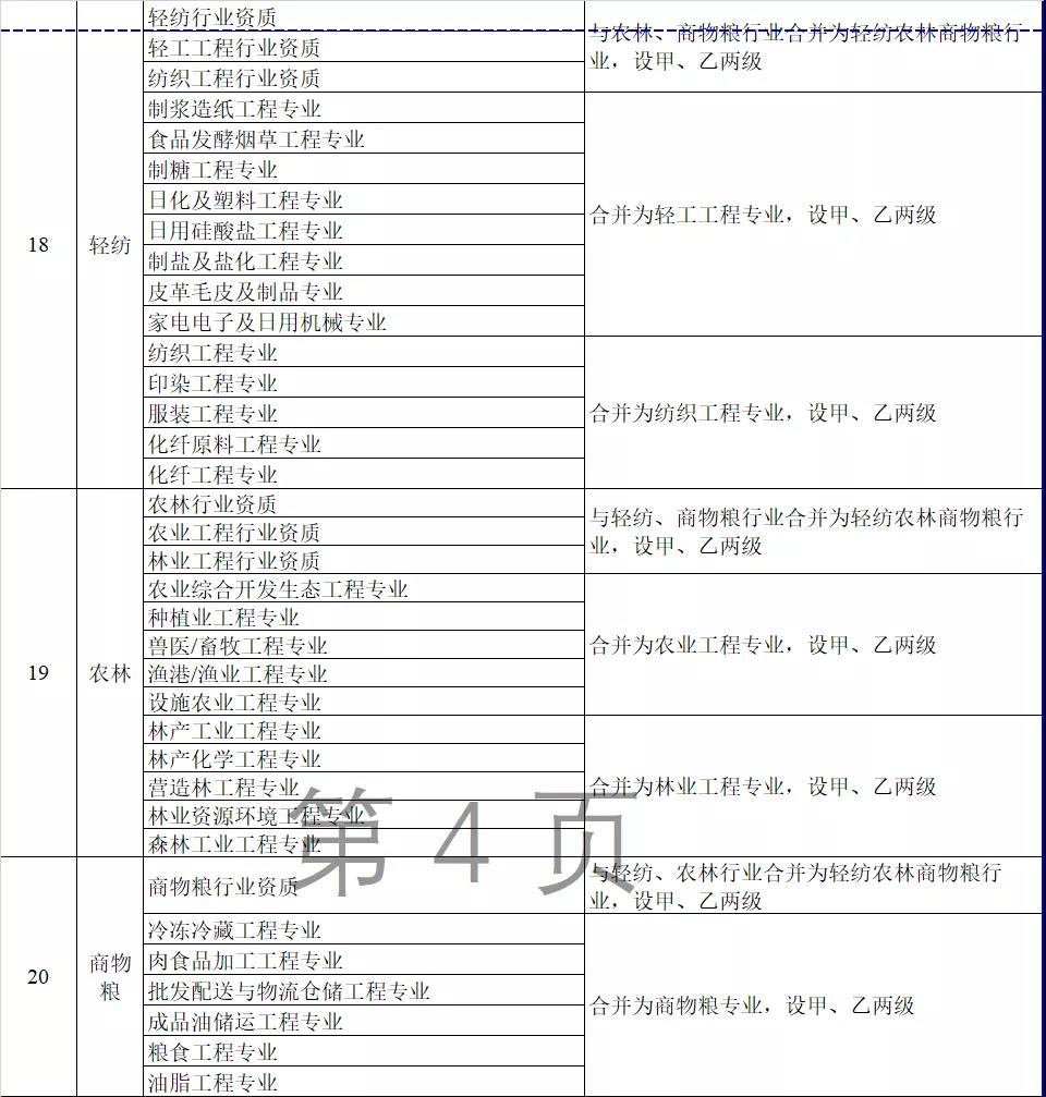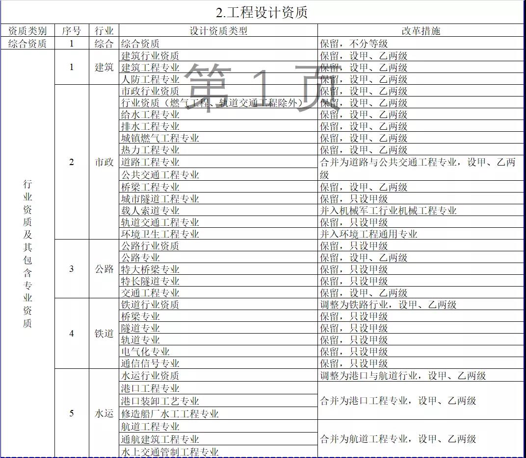 2.工程設計資質。保留綜合資質;將21類行業資質整合為14類行業資質;將151類專業資質、8類專項資質、3類事務所資質整合為70類專業和事務所資質。綜合資質、事務所資質不分等級;行業資質、專業資質等級原則上壓減為甲、乙兩級(部分資質只設甲級)。