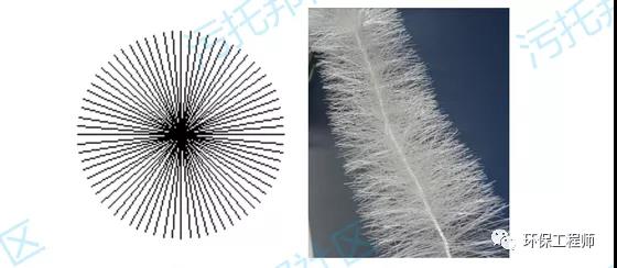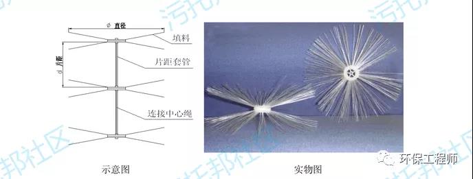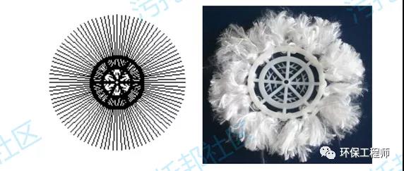 3. 彈性填料比半軟性填料更富剛柔并兼,其第 1 代結構呈瓶刷狀(見下圖 3);其第 2 代呈片狀,且剖面呈 X 形燕尾狀,彈性絲隨中心扣周邊放射(見下圖 4),該填料具有更大的空隙率、更高的氣泡切割能力;可提高氧利用率,是一種節能型的彈性立體填料。規格如表 3、4。
