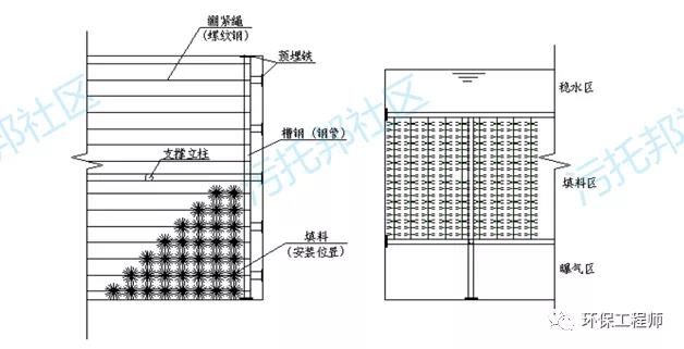 b) 接觸氧化池宜設置兩層懸掛支架,將填料兩端固定在支架上,底層支架應高于曝氣頭 200mm以上。支架宜采用不銹鋼管、角鋼、槽鋼及繃緊繩等材料。