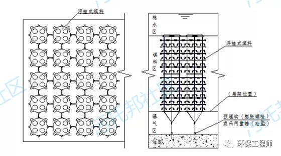 a) 浮掛式填料僅需底端固定,宜直接固定在池底預埋鉤或膨脹螺栓吊鉤上。
