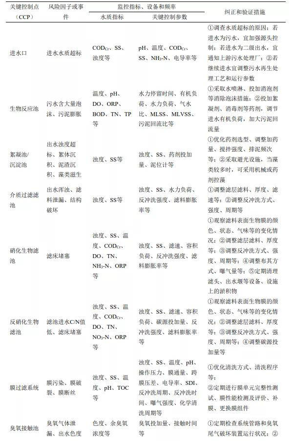 《水回用導則 再生水廠水質管理》首次將HACCP體系引入再生水廠水質管理。針對再生水廠水源水質復雜多變、處理環節長等特點,為滿足再生水水質安全保障需求,再生水廠應根據水源特點、處理工藝和水質管理目標,基于風險分析與關鍵控制點(HACCP)體系,制定再生水廠水質管理措施。水質管理措施包括風險識別、CCP設置和管理、水質異常應對措施、可持續改進、應急管理等方面,其制定流程如圖2所示。再生水廠的潛在風險、CCP監控指標及水質異常應對措施示例如表1所示。當CCP的水質指標和控制參數超出目標范圍時,應及時采取應對措施,使其盡快恢復正常運行狀態。