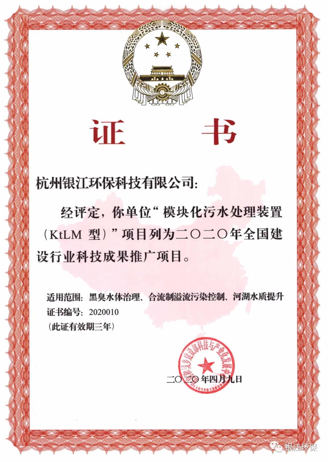 銀江環保“模塊化污水處理裝置(KtLM型)”列入全國建設行業科技成果推廣項目發布日期:2020-05-15