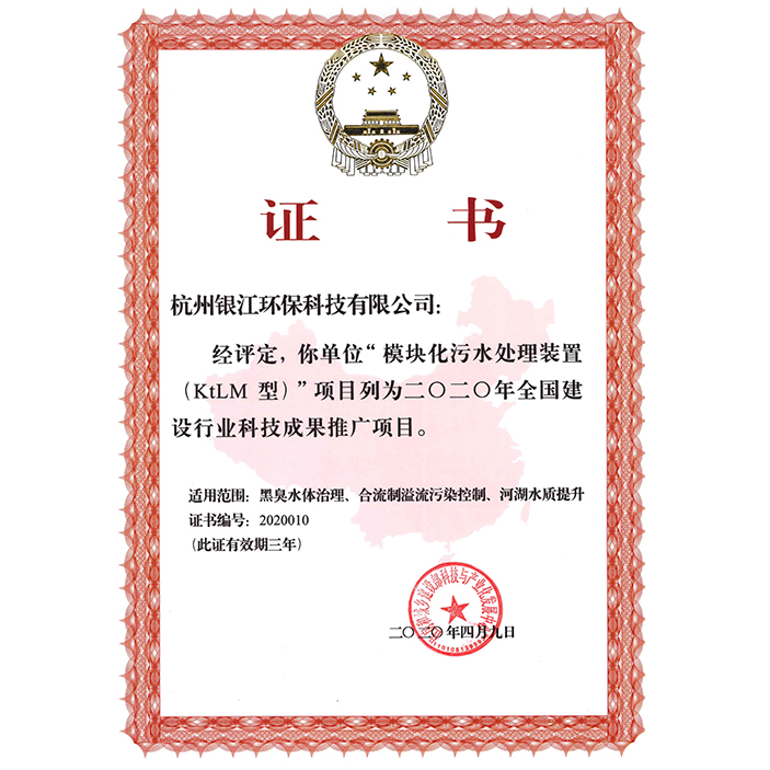 該技術(shù)在住房和城鄉(xiāng)建設(shè)部科技與產(chǎn)業(yè)化發(fā)展中心主持召開的“模塊化污水處理裝置(KtLM型)”科技成果評估會上, 評估委員會專家一致認(rèn)為:該項目開發(fā)的與MBBR工藝相結(jié)合的浮選沉淀工藝具有創(chuàng)新性,達(dá)到國內(nèi)領(lǐng)先水平,同意通過評估,并被列入2020年全國建設(shè)行業(yè)科技成果推廣項目。