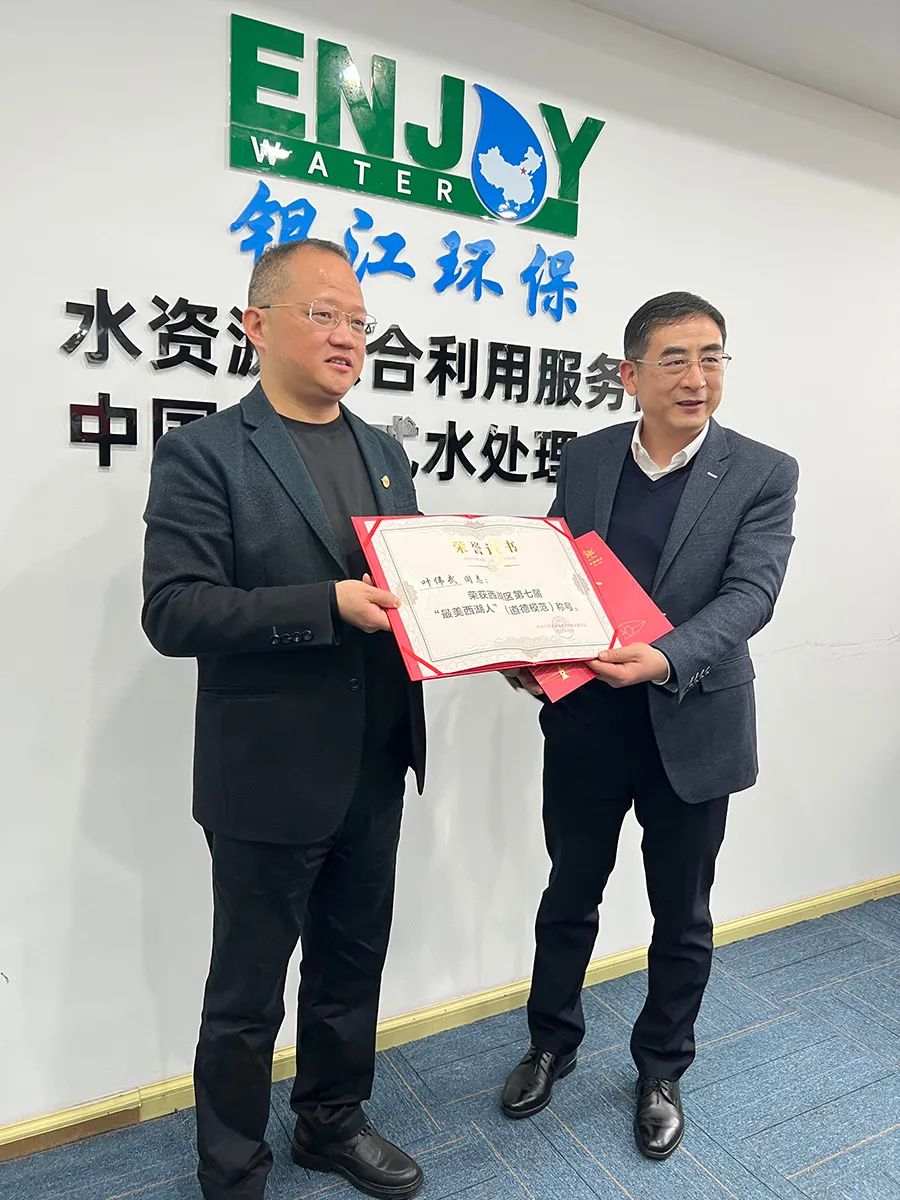 1月13日上午,西湖區(qū)領導走訪銀江環(huán)保,區(qū)委副書記陸志敏為董事長葉偉武頒發(fā)西湖區(qū)第七屆“最美西湖人”(道德模范)稱號榮譽證書。